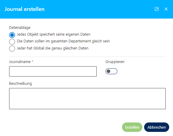 Drücken Sie auf "Journal erstellen" und geben Sie dem Journal einen Namen. Die drei Möglichkeiten zur Datenablage haben verschiedene Nutzen: