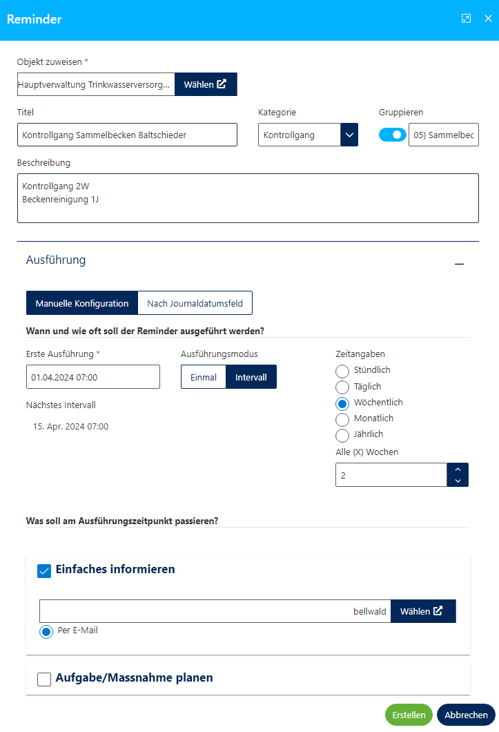Beschreibung: Eine sinnvolle Beschreibung verwenden, die den Reminder kurz beschreibt und ebenfalls auch den Intervall aufzeigt (Bsp: Kontrollgang 2W / Beckenreinigung 1J)