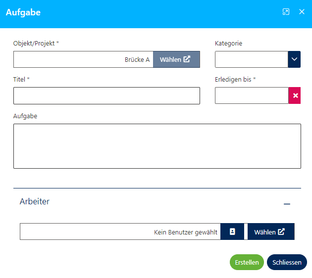 Füllen Sie alle Informationen aus, die benötigt werden, um die Aufgabe abzuarbeiten. Weisen Sie zuletzt einen Arbeiter zu.