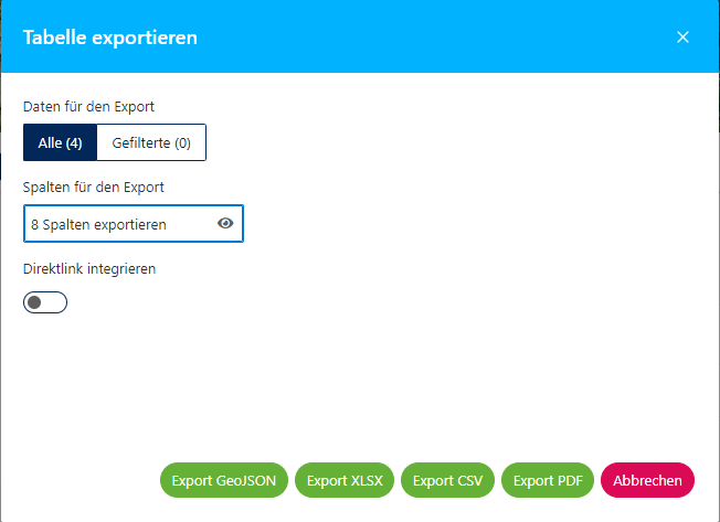 Nun können Sie wählen, ob die ganze Tabelle (Alle) oder nur ein zuvor ausgewählter Teil (Gefilterte) exportiert werden soll. Danach können Sie die Spalten, also Unterkategorien auswählen, die Ihr Export enthalten soll und können dann entscheiden, ob ein Direktlink in die Datei angefügt werden soll, der auf die ursprüngliche Tabelle zurückführt.