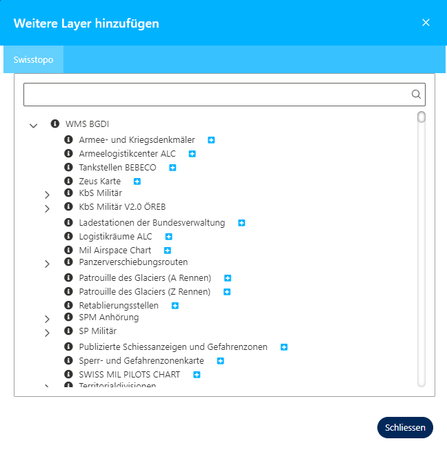 Sie haben die Möglichkeit auf den Swisstopo-Dienst des Bundes mit über 700 Karten zuzugreifen. Klicken Sie auf "Layer hinzufügen"->"Swisstopo" und suchen Sie nach dem oder den gewünschten Layer. Mit dem Plus-Symbol fügen Sie den Layer hinzu.