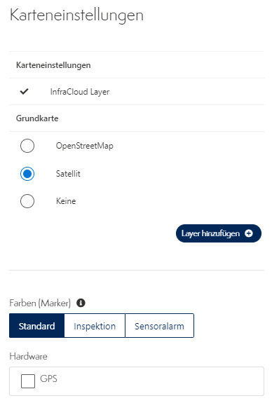 Sie können die Grundkarte von OpenstreetMap auf eine Satellitenkarte wechseln oder auch gar keine Grundkarte wählen. Das InfraCloud Layer wird immer angezeigt.