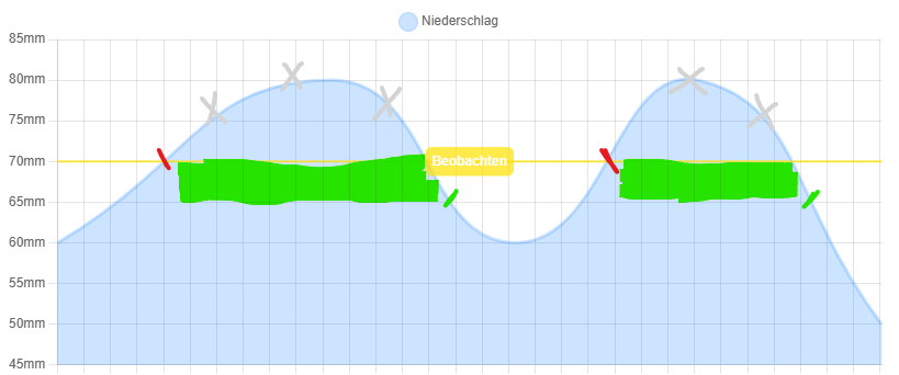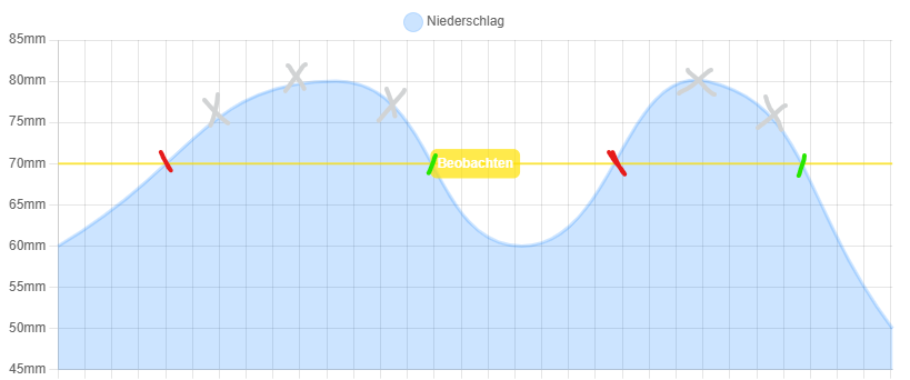Sobald ein Alarm erreicht wurde, wechselt der Graph in den Alarmstatus. Bei weiteren neuen Daten wird nun nicht jedes Mal wieder ein Alarm verschickt. Ausnahme, sobald eine neue Alarmstufe wird erreicht.