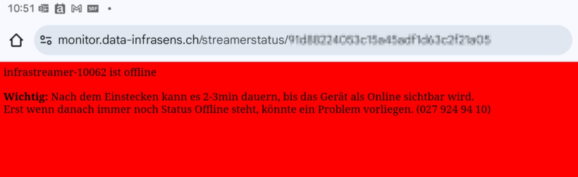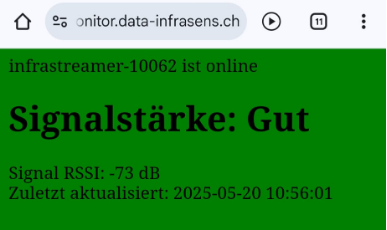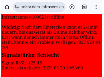 ⚠ Wichtig: Bitte Streamer-Nummer (infrastreamer 100xx) zusammen mit GPS-Daten notieren, damit das Gerät dem richtigen Standort zugwiesen werden kann.