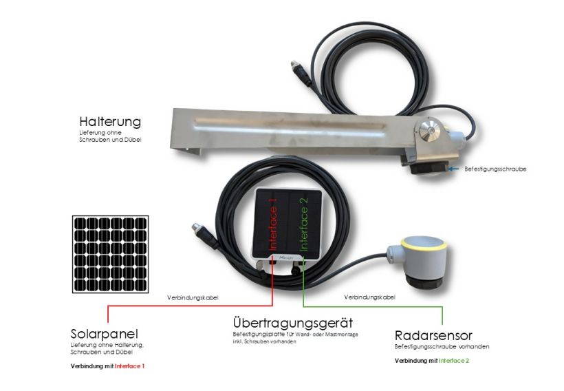 - Montage Hardware: Radarsensor mit Halterung, Übertragungsgerät mit Befestigungsplatte und Solarpanel je nach Bedarf.