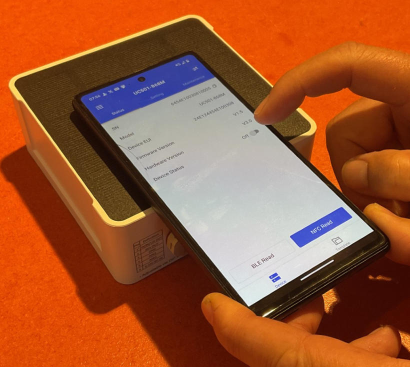 - Nach dem Öffnen der App erfolgt die Verbindung mit dem Gerät über die Funktion „NFC Read“. Dazu ist der entsprechende Button auszuwählen und das Smartphone auf das Gerät zu legen.