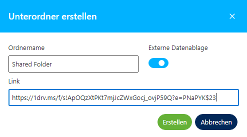 Es ist möglich, geteilte Ordner von OneDrive, Google Drive und anderen Diensten direkt in die Objektdateien von InfraCloud einzubinden. Dazu müssen lediglich der Ordnername und der geteilte Link angegeben werden.